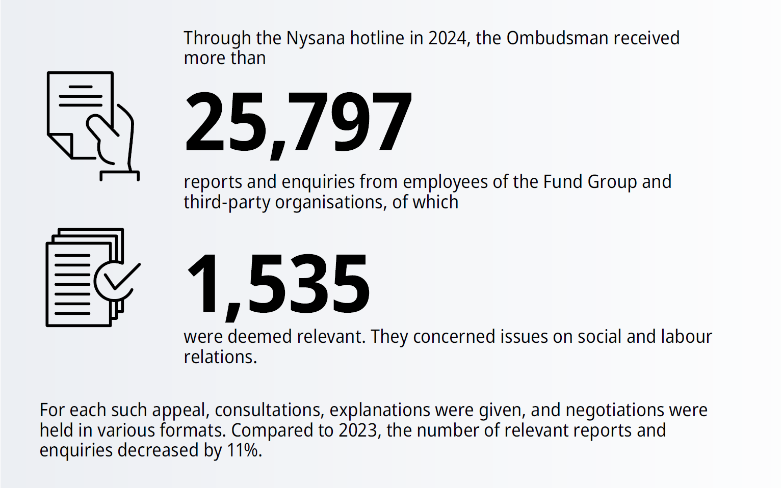 To accept reports and enquiries, Nysana hotline call centre has been set up jointly with the Centre for Social Interaction and Communications, to which all Ombudsmen of the portfolio companies are connected