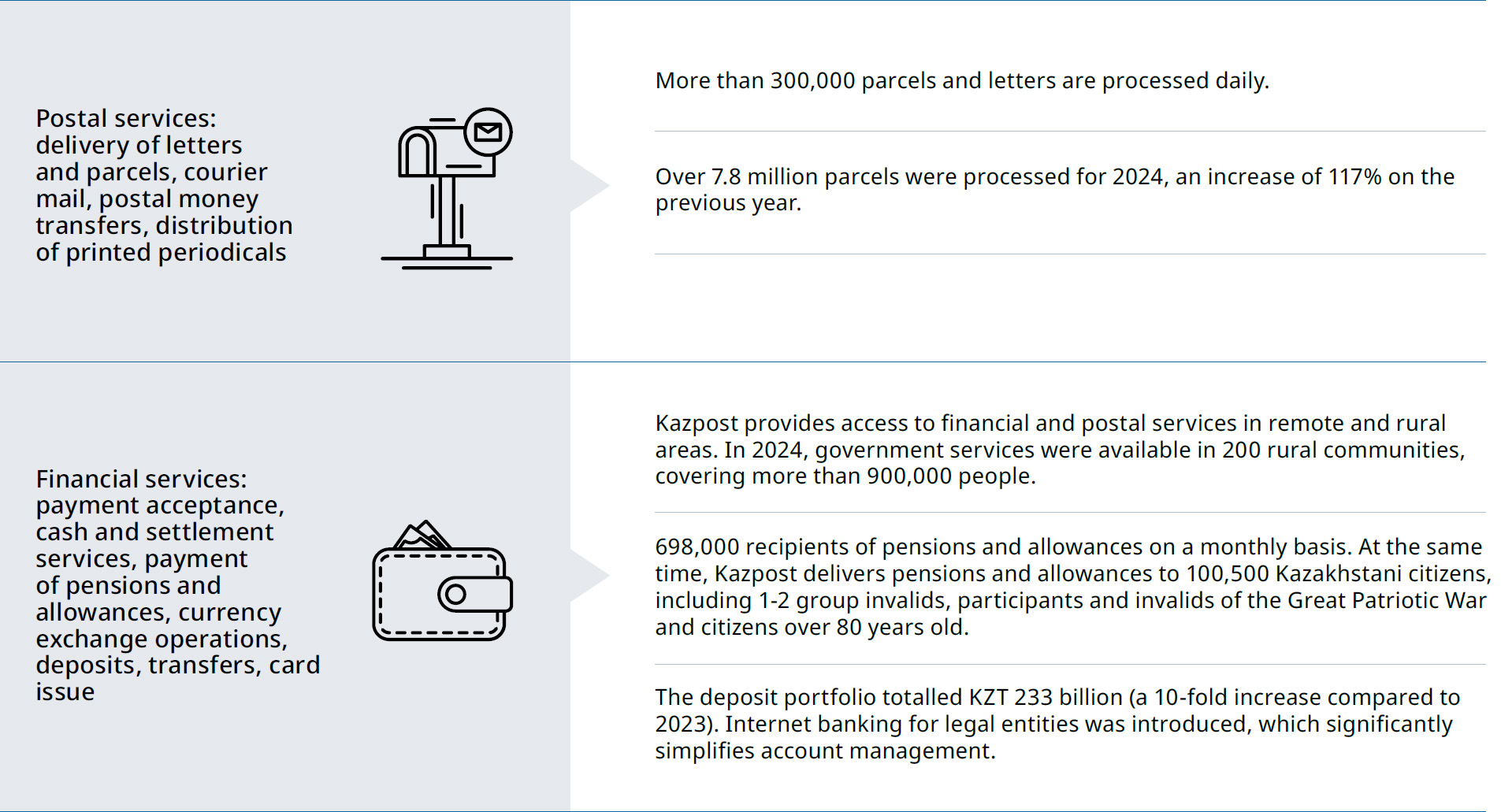 Portfolio company Kazpost JSC acts as the national operator of postal services in Kazakhstan and has the largest branch network in the country, covering almost the entire territory, including districts and rural settlements (about 3,000 post offices). Kazpost JSC provides a wide range of services to the public.
