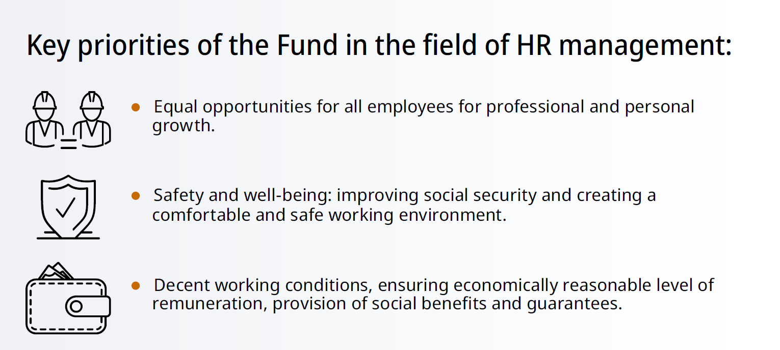 - Focus on maintaining the balance of interests of employees and employers by implementing IR, HSE, and CSR practices across the Fund group companies.