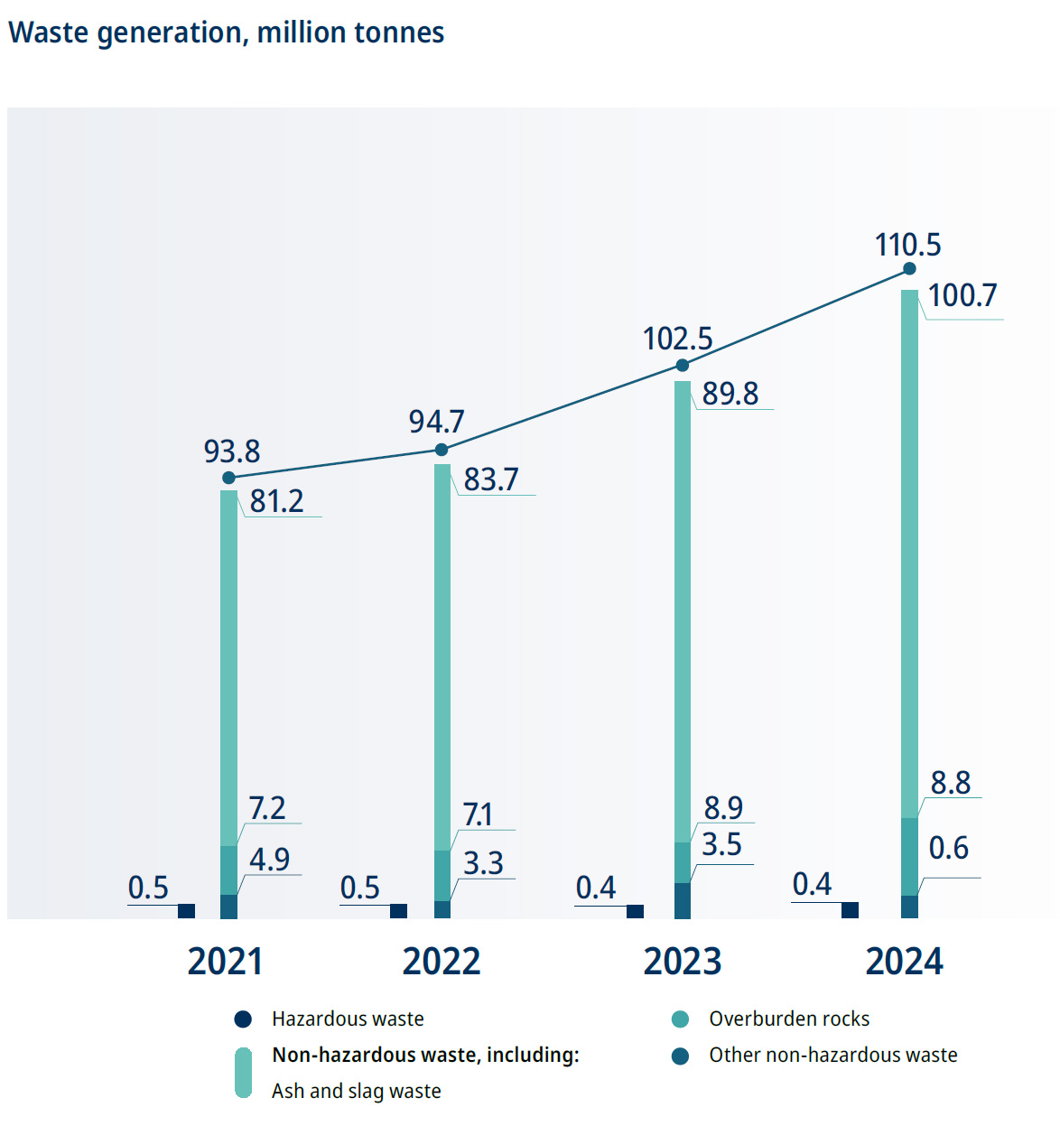 In 2024, 110.5 million tonnes of waste were generated, which is 8% higher than in the previous year. At the same time, the amount of hazardous waste was 0.37 million tonnes, down 6% from 2023.