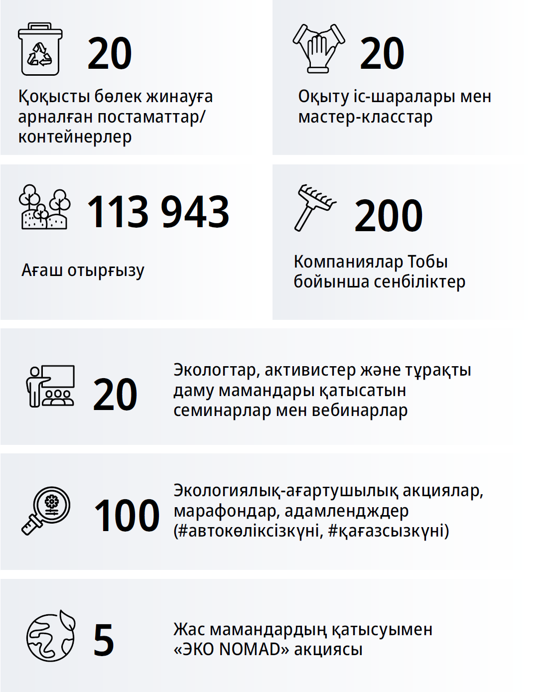 2024 жылы біз Қор Тобының ұйымдары қатысатын қалалар мен ауылдарда жаңа жасыл аймақтарды құру бойынша жұмыс істедік, сондай-ақ өндірістік объектілердің аумағында ағаш отырғызуды жүзеге асырдық. «ҚазМұнайГаз» ҰК АҚ қызметкерлері көшбасшы болып, 97,2 мың ағаш пен бұта отырғызды. Сонымен қатар, Арал теңізінің құрғаған түбінде (АТҚТ) экологиялық жағдайды жақсарту бойынша мемлекет жүргізіп жатқан жұмыстар аясында 15 мың га алаңда 4,5 млн-нан астам сексеуіл көшеттері отырғызылды.