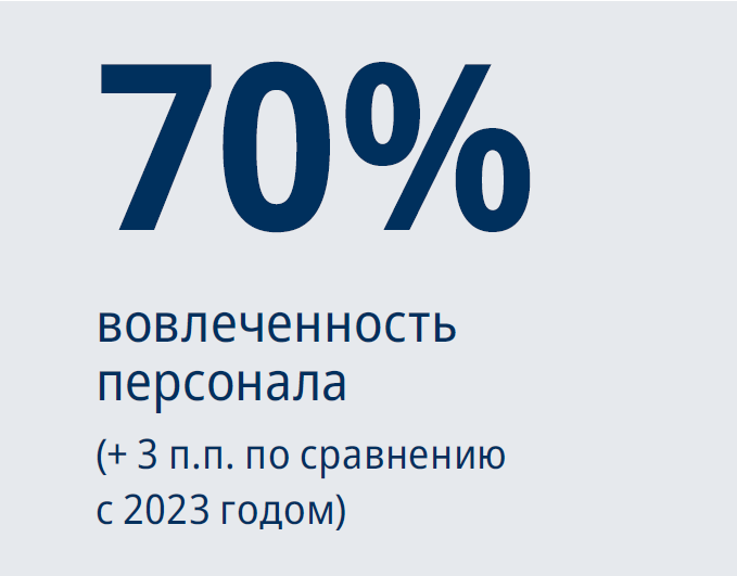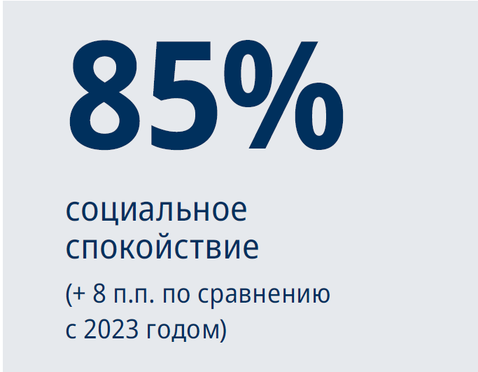 По результатам отчётного периода индекс социальной стабильности (SRS) составляет 72% (+2 п.п. по сравнению с 2023 годом). Данный показатель – это совокупный индекс вовлечённости, благополучия и социального спокойствия.
