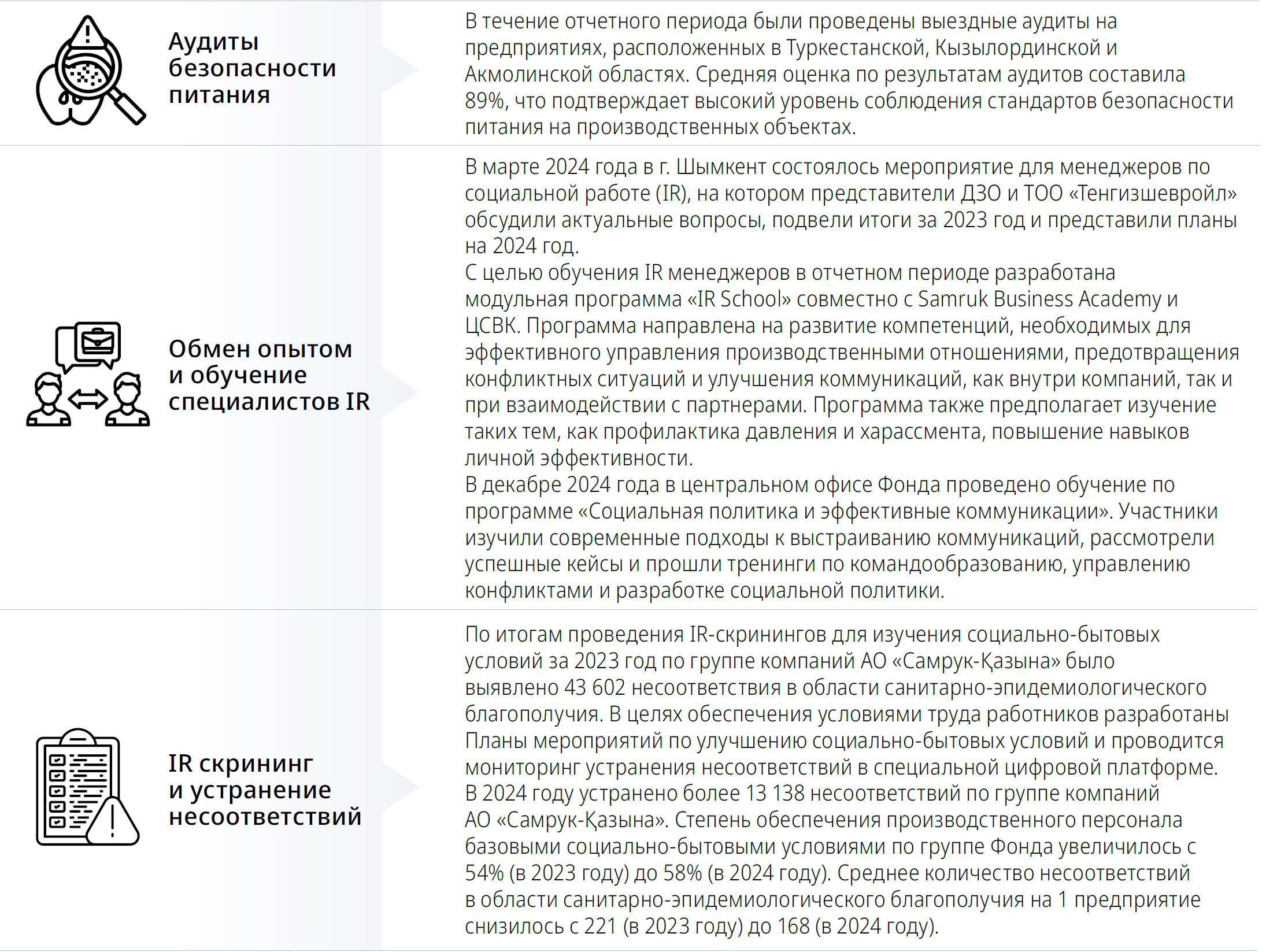 Мы развиваем Industrial Relations (IR) для улучшения взаимоотношений между работодателем, работниками, подрядными организациями и профсоюзами, а также для развития социального диалога и партнёрства. С 2022 года в Фонде внедрён единый корпоративный стандарт производственных отношений, целью которого является повышение уровня вовлечённости, лояльности и удовлетворённости работников. А это в свою очередь снизит уровень текучести кадров, отпусков по болезни, прогулов и положительно повлияет на производительность труда.