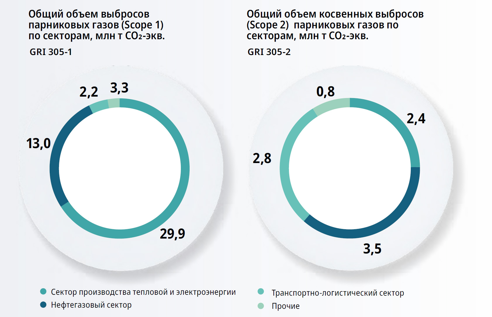 Портфельными компаниями ведётся учёт прямых (Охват 1) и косвенных (Охват 2) выбросов следующих парниковых газов: диоксид углерода, метан и закись азота. Выбросы парниковых газов Охвата 1 в 2024 году составили 48,4 млн т CO2-экв. (снижение на 3% к 2023 году). Косвенные выбросы парниковых газов (Охват 2) составили 9,5 млн т CO2 (5% снижение по сравнению с 2023 годом).