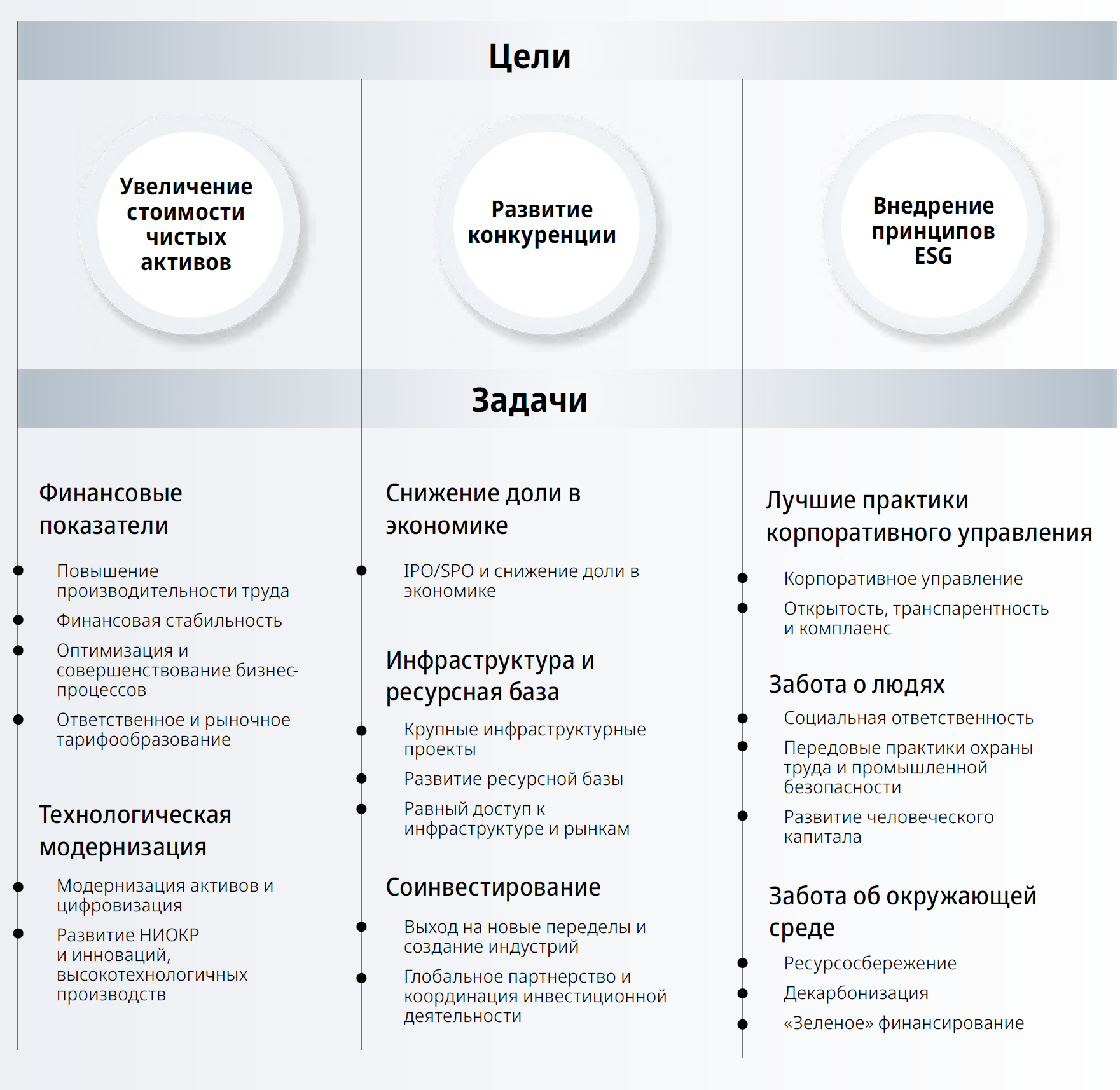 Стратегия устойчивого развития является неотъемлемой частью нашей Стратегии развития и обеспечивает достижение наших долгосрочных целей. Внедрение ESG-принципов позволяет нам не только укрепить репутацию ответственного инвестора, но и сформировать глобальные партнерства и привлечь международные инвестиции, что, в свою очередь, способствует снижению доли государства в экономике и повышению общей конкурентоспособности портфельных компаний.