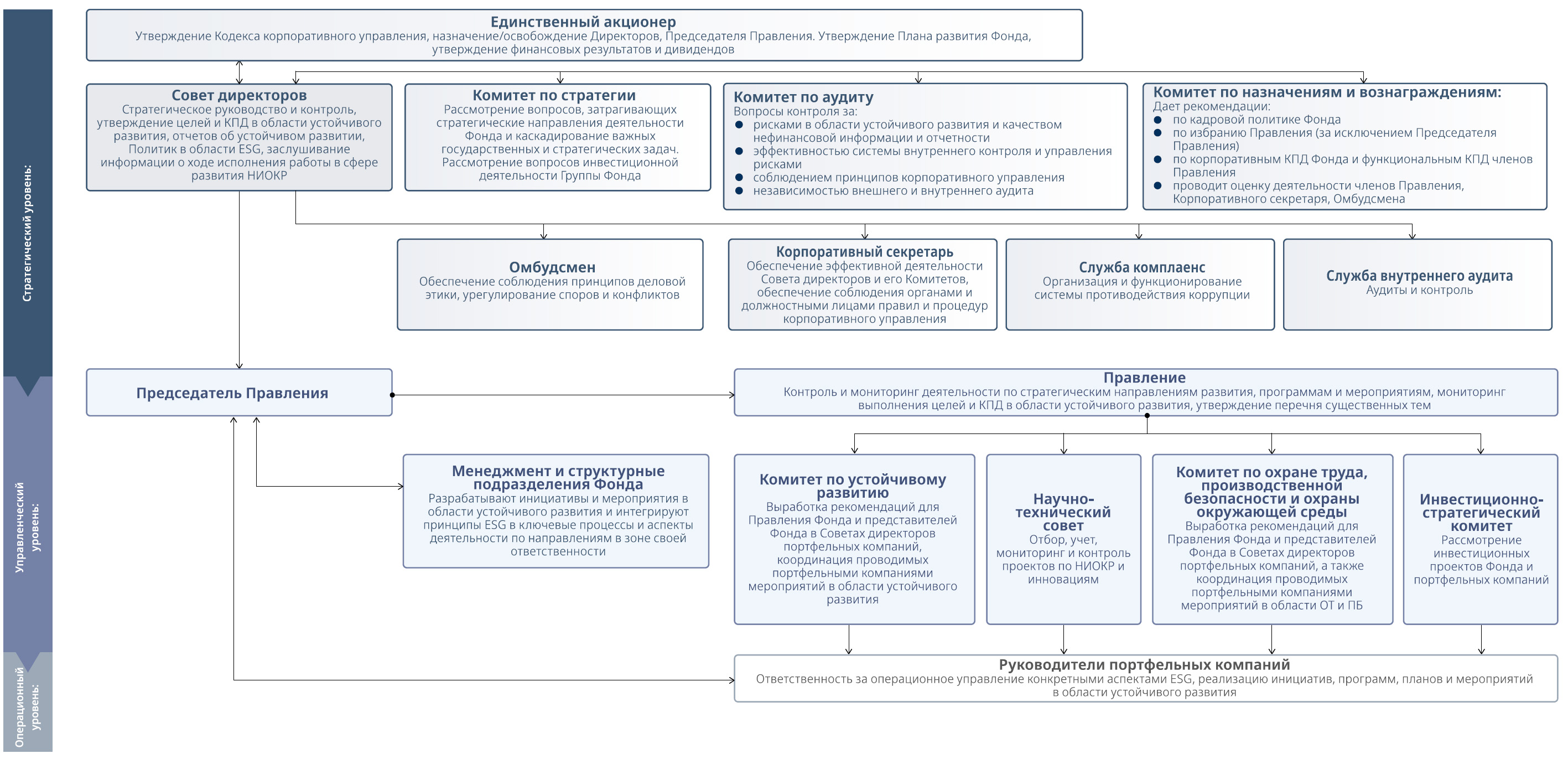 Управление вопросами устойчивого развития в Фонде относится к сфере полномочий Управляющего директора по стратегии и управлению активами. Уполномоченное лицо обеспечивает разработку, совершенствование и внедрение политик/стандартов в области устойчивого развития, а также контроль и мониторинг за исполнением работ по устойчивому развитию и достижению долгосрочных выгод.