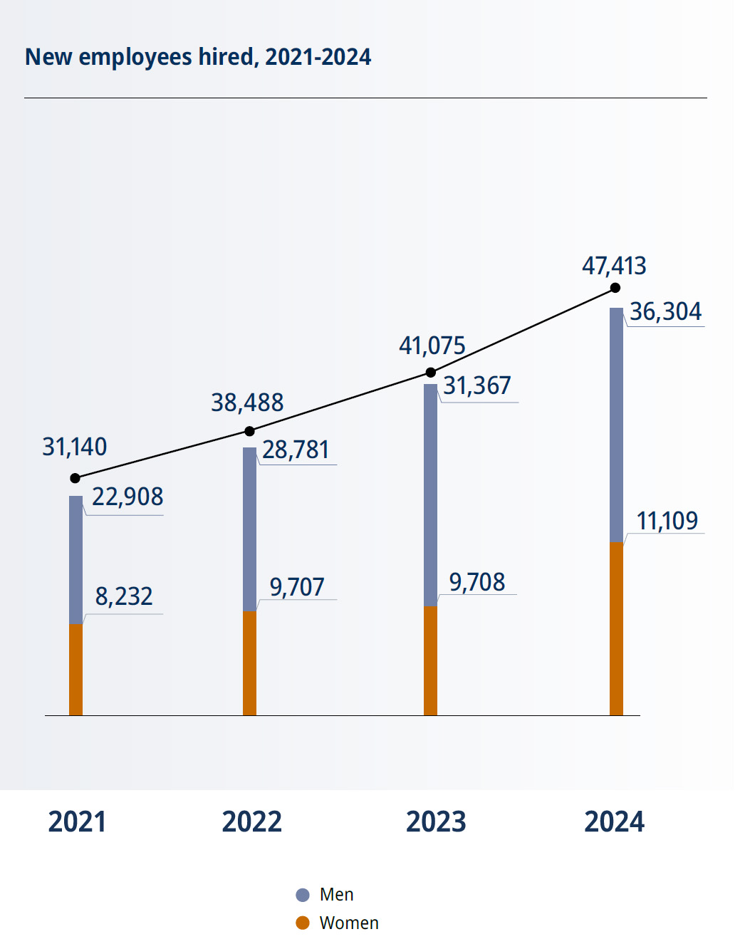 The Fund’s Group employed 47,413 people in 2024, which was 15.4% more than in 2023. Most of the employees were hired in Astana. The employee turnover rate at the end of 2024 was approximately 17%.