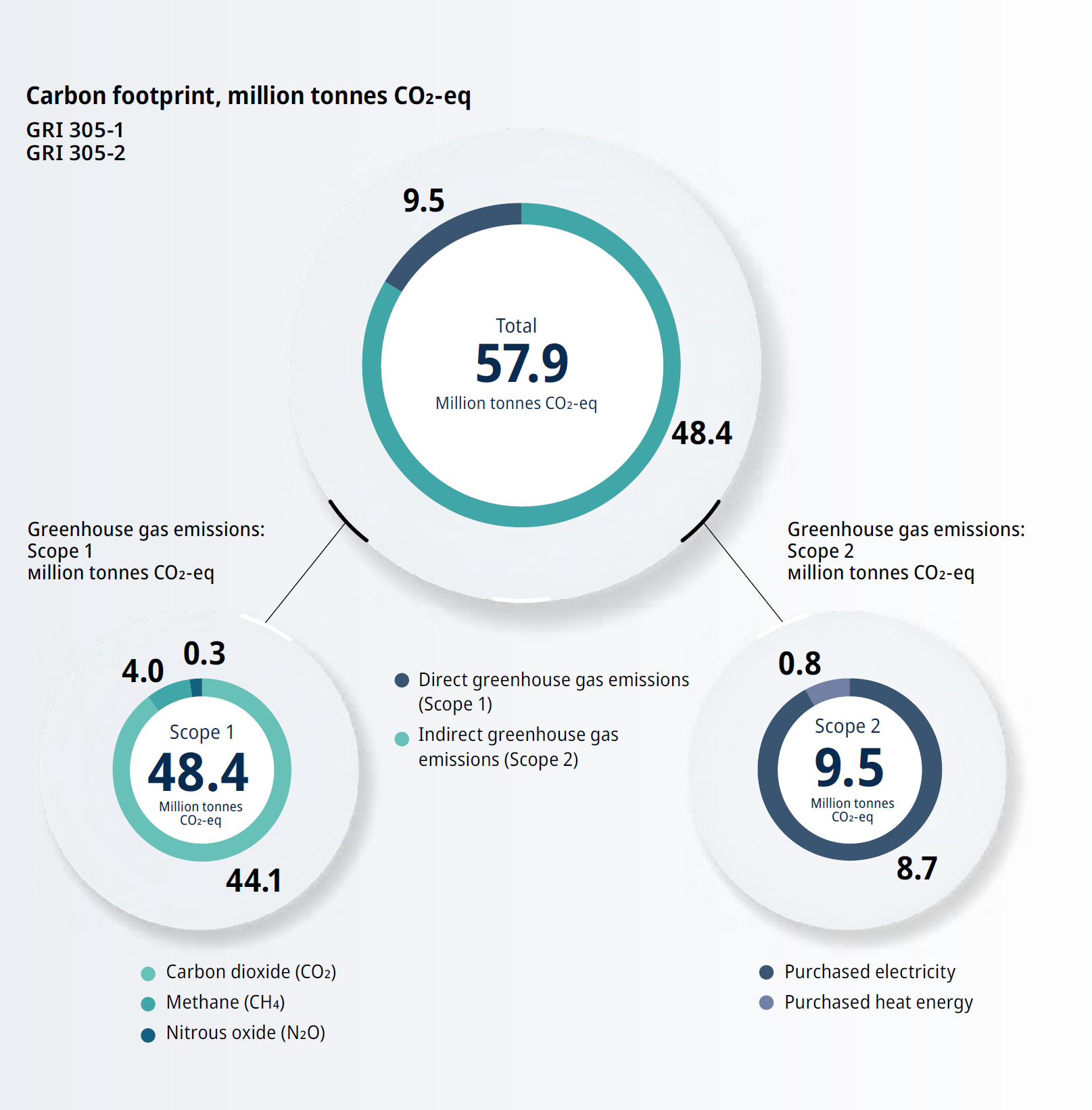 The portfolio companies keep records of direct (Scope 1) and indirect (Scope 2) emissions of the following greenhouse gases: carbon dioxide, methane and nitrous oxide. Scope 1 greenhouse gas emissions in 2024 were 48.4 million tonnes of CO2-eq. (a 3% decrease from 2023). Indirect greenhouse gas emissions were 9.5 million tonnes CO2 (5% decrease from 2023).