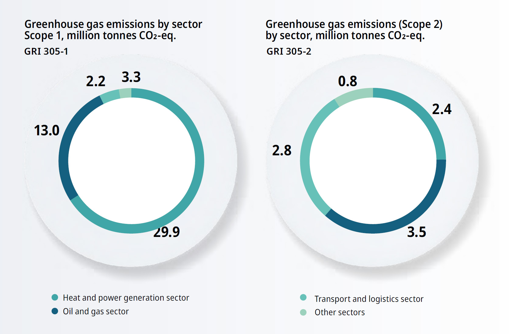 Among indirect greenhouse gas emissions, the largest share of CO2 emissions comes from purchased electricity (92%). Here emissions were split between the oil and gas sector – 3.47 million tonnes of CO2-eq (36%), the railway sector (27%) and the power sector, where the electricity transmission sector accounted for about 25% of Scope 2 emissions.