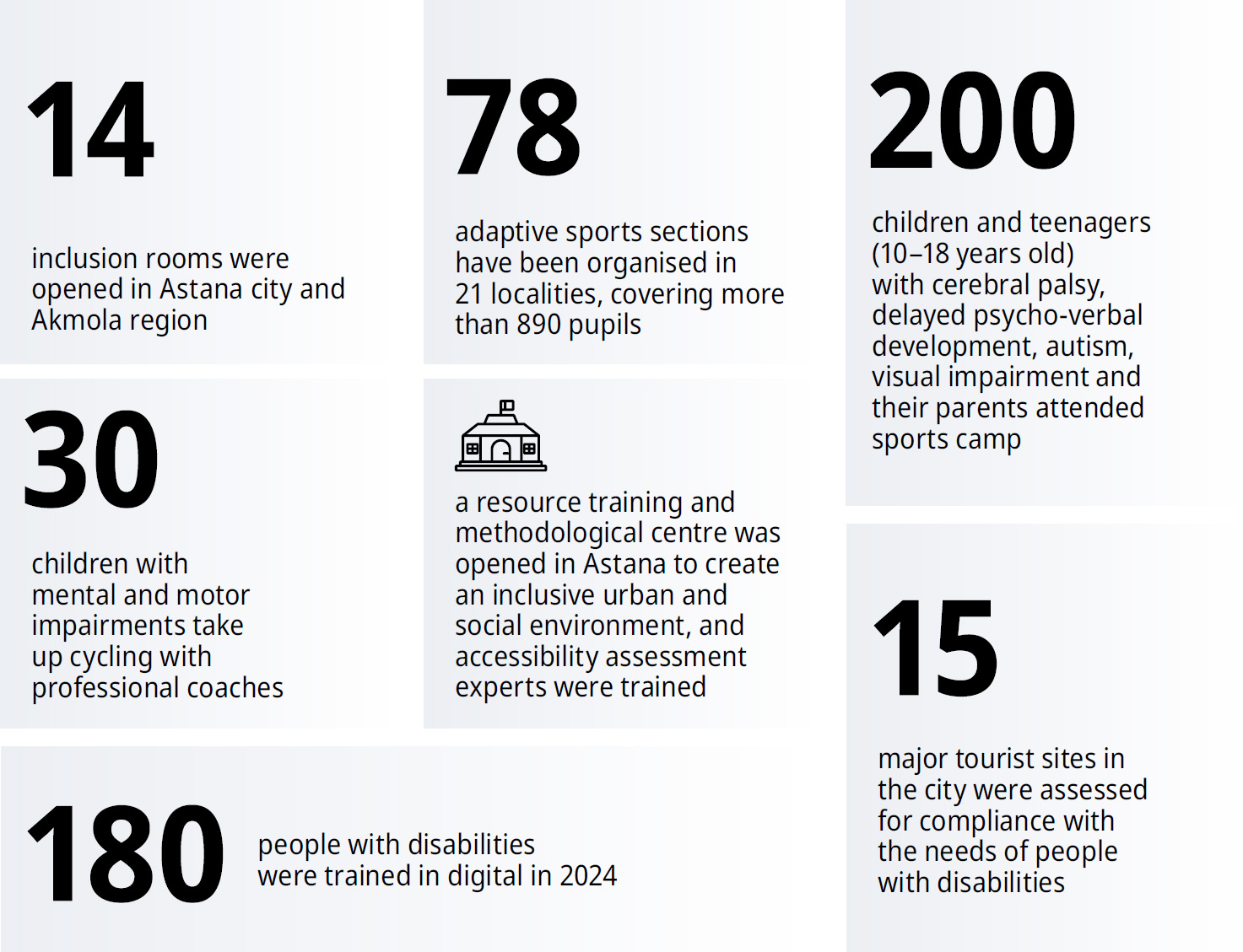 We open rehabilitation centres, sports complexes and adaptive sports sections in the regions of Kazakhstan. We train young people with disabilities in digital professions and assist them in finding employment. In addition, we open inclusive classrooms in schools and open early intervention centres for children with autism.