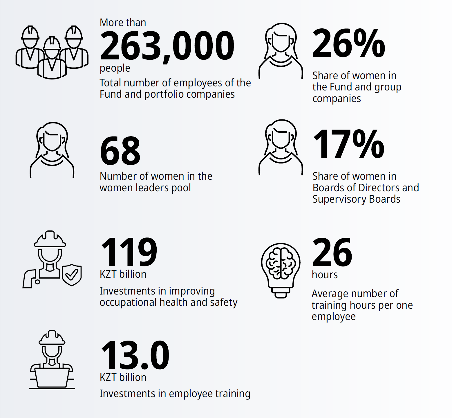 - Focus on maintaining the balance of interests of employees and employers by implementing IR, HSE, and CSR practices across the Fund group companies.