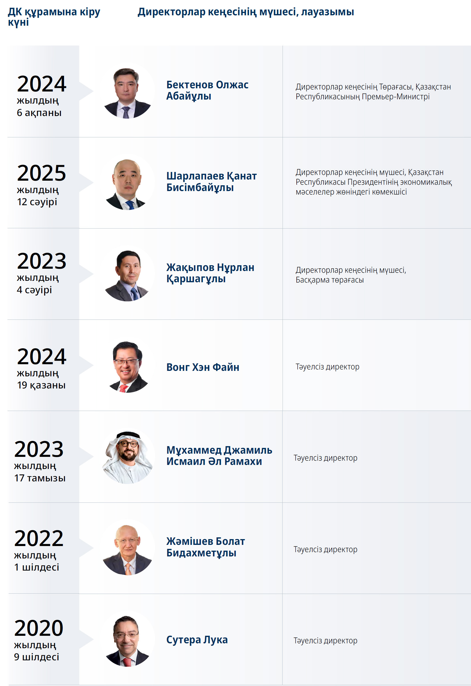 Директорлар кеңесінің мүшелері үш жылға дейінгі мерзімге сайланады, кейіннен қызметтің қанағаттанарлық нәтижелері болған жағдайда тағы үш жылға дейінгі мерзімге қайта сайлануы мүмкін болады. 2025 жылғы сәуірдегі жағдай бойынша Директорлар кеңесінің құрамында Директорлар кеңесінің құрамында болу мерзімі бір жылдан аз болған екі мүшесі, Директорлар Кеңесінің құрамында болу мерзімі бір жылдан астам төрт мүшесі, және үш жылдан астам болған бір мүшесі кіреді.