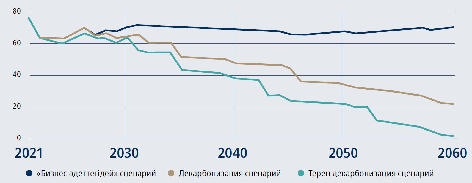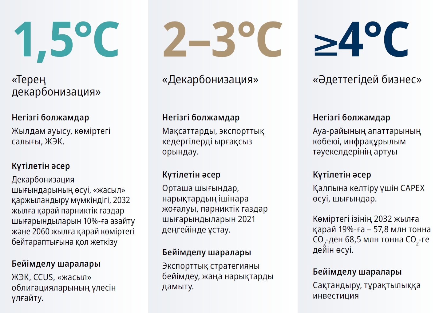 Дамудың үш сценарийін талдау негізінде Қор ең өршіл жолды – терең декарбонизацияны болжайтын 3-Сценарийді таңдады. Біз операциялық және инвестициялық шешімдерімізді осы сценарийге сәйкес бейімдеп, бизнесті климаттық қиындықтар мен мүмкіндіктерді ескере отырып өзгертеміз.