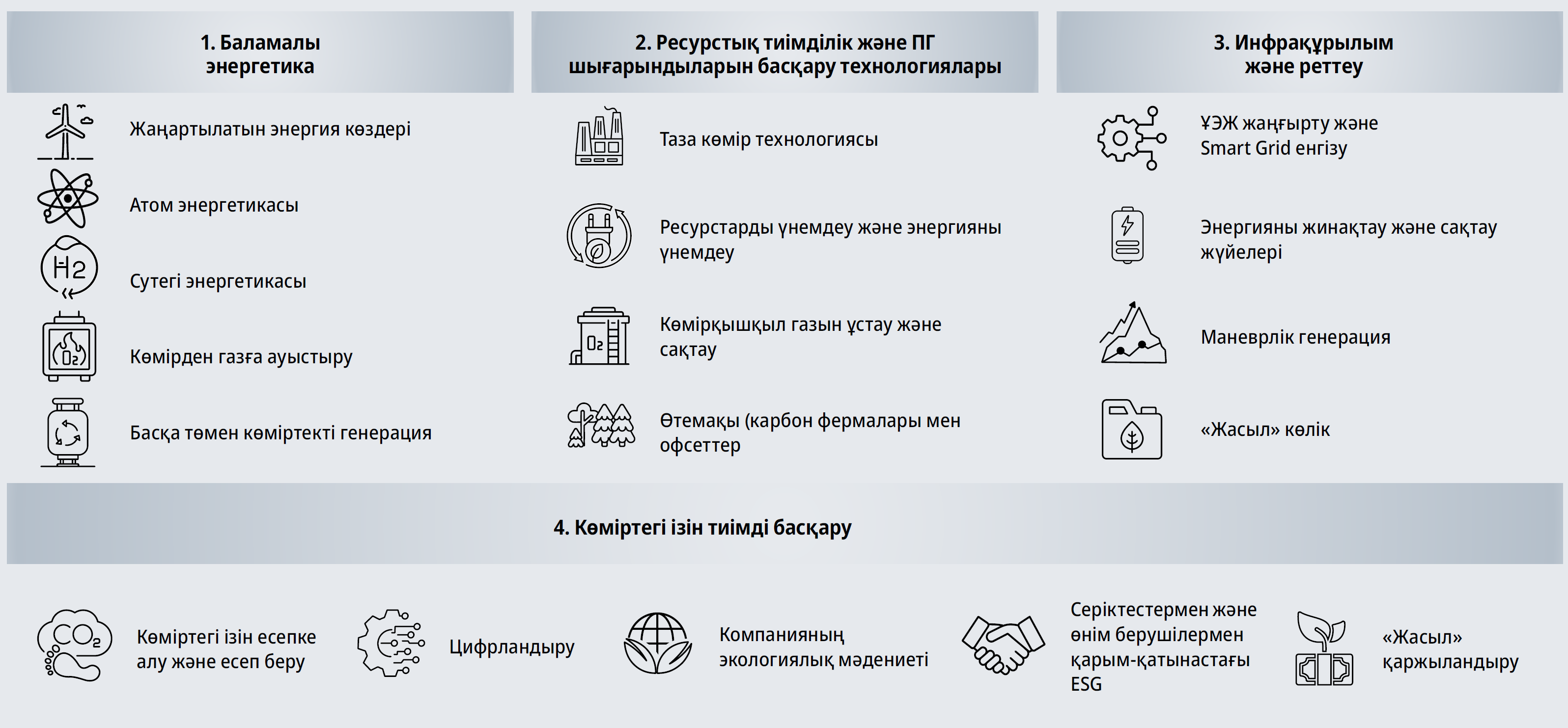 Біз экологиялық қауіпсіздікті толық баламасыз көмір мен мұнай активтерінен күрт бас тартуды болдырмай, сенімді энергиямен қамтамасыз етумен ұштастыру керек деген қағиданы ұстанамыз. Біздің тәсіліміз төрт негізгі бағытқа негізделген.