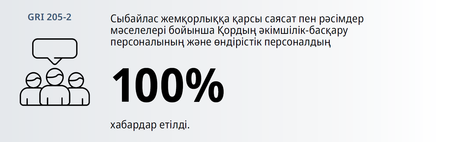 2024 жылы жемқорлыққа қарсы мәдениетті қалыптастыруға бағытталған барлығы 985 іс-шара ұйымдастырылып, өткізілді. Оның ішінде 453 іс-шара компаниялардың жоғары басшылығының қатысуымен өтті. Оған 139 082 жұмыскер қатысты, бұл Қор тобы жұмыскерлерінің жалпы санының 55%-ын құрайды.