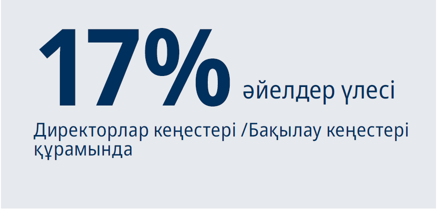Корпоративтік басқару кодексіне сәйкес Директорлар кеңесінің құрамында жеке сипаттамалары, жасы және гендерлік құрамы бойынша жеткілікті әртүрлілікті қамтамасыз ету ұсынылады. Атап айтқанда, Қордың және портфельдік компаниялардың директорлар Кеңесі құрамындағы әйелдердің ұсынылатын үлесі Директорлар кеңесі мүшелерінің жалпы санының кемінде отыз пайызын құрайды.