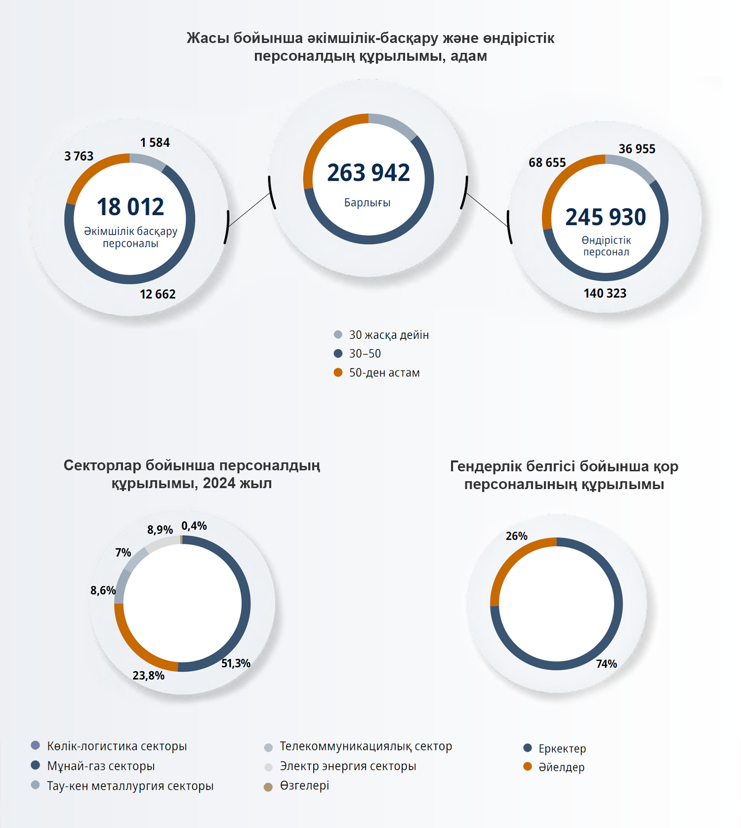 Қор тобында 2024 жылдың аяғында 263 942 адам жұмыс істейді (есепті кезеңнің 31 желтоқсандағы жағдай бойынша орташа тізімдік саны), оның 97% тұрақты негізде жұмыспен қамтылған. Соңғы төрт жылда Қорда жұмыскерлер санында айтарлықтай өзгерістер болған жоқ. Жұмыскерлердің ең көп саны көлік-логистика секторына (51%) және мұнай-газ секторына (24%) тиесілі.