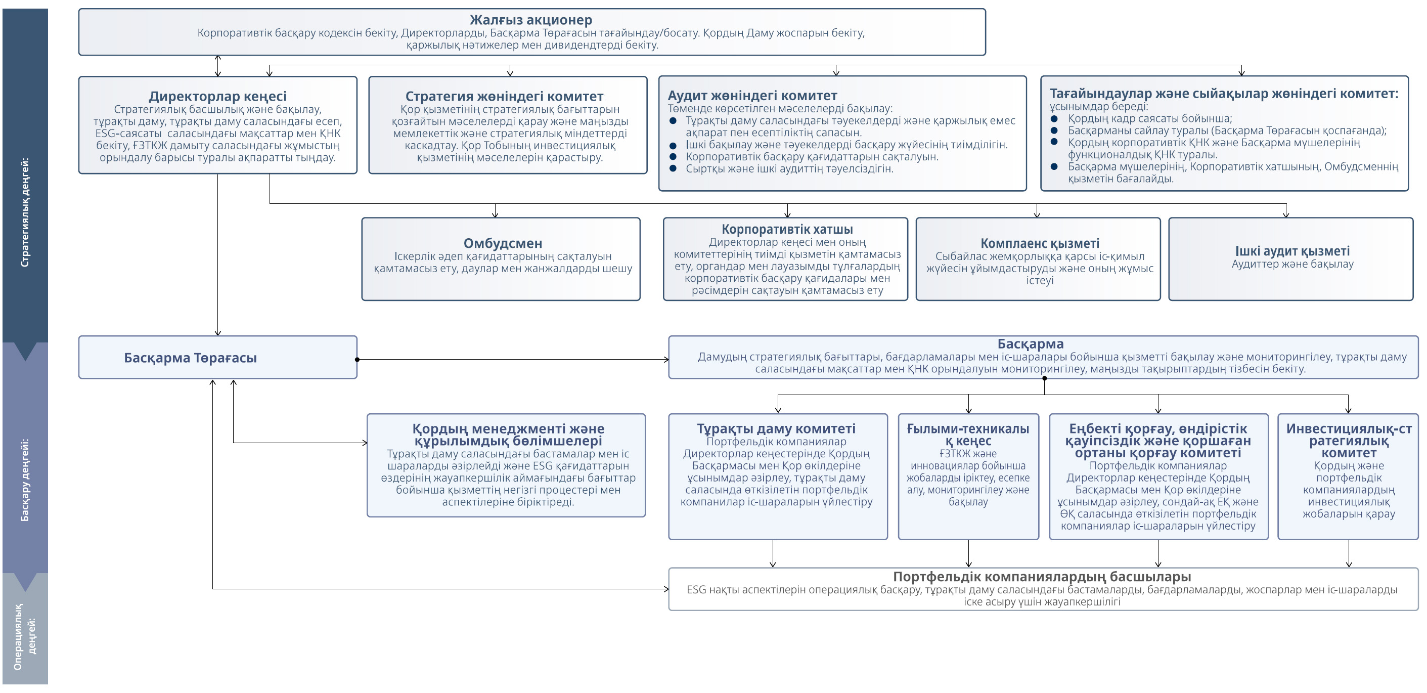 Қордағы тұрақты даму мәселелерін басқару Стратегия мен активтерді басқару жөніндегі Басқарушы директордың өкілеттік саласына жатады. Уәкілетті тұлға тұрақты даму саласындағы саясаттарды/стандарттарды әзірлеуді, жетілдіруді және енгізуді, сондай-ақ тұрақты даму және ұзақ мерзімді пайдаға қол жеткізу жөніндегі жұмыстардың орындалуын бақылауды және мониторингті қамтамасыз етеді.
