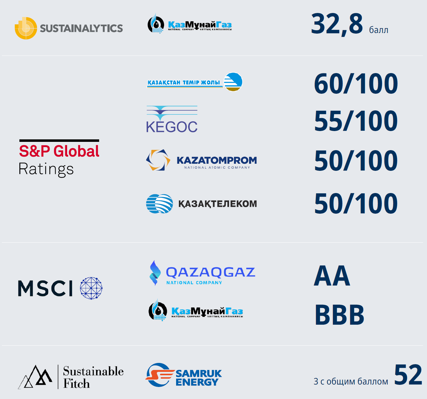 Портфельдік компаниялар Қазақстан компаниялары арасында да, өз салаларында әлемдік аренада да халықаралық ESG-рейтингтерінде басым түрде оң нәтижелер көрсетуде.