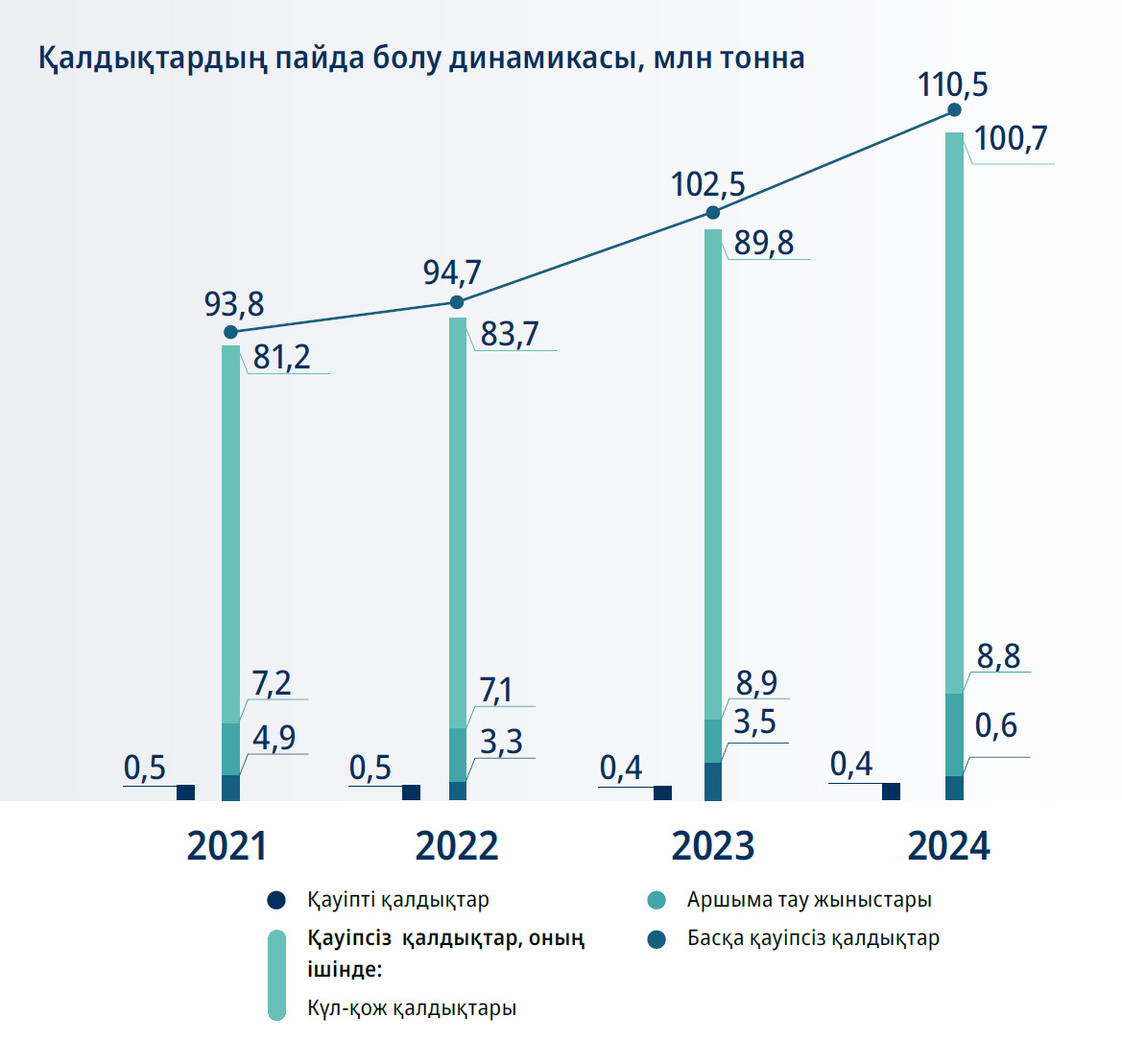 2024 жылы 110,5 млн тонна қалдық пайда болды, бұл өткен жылдың көрсеткіштерінен 8%-ға артық. Бұл ретте қауіпті қалдықтардың саны 0,37 млн тоннаны құрады, бұл 2023 жылғы көрсеткіштен 6%-ға төмен.