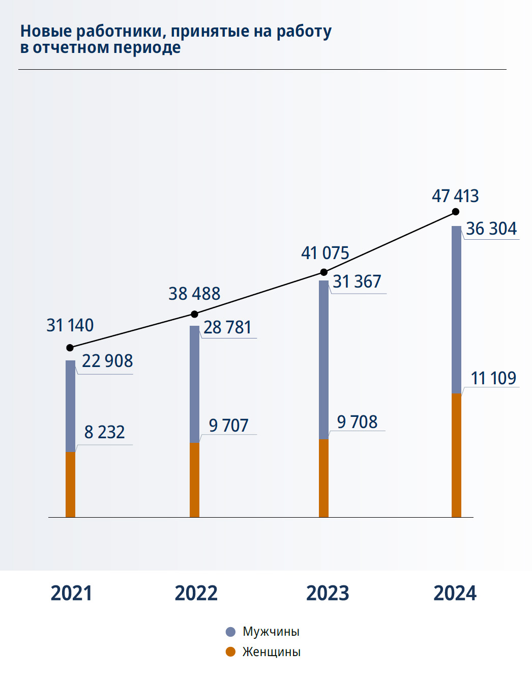 Группа Фонда приняла на работу 47 413 работников в 2024 году, что на 15,4% больше, чем в 2023 году. Больше всего работников принято в Астане. Коэффициент текучести кадров по итогам 2024 года составил около 17%.