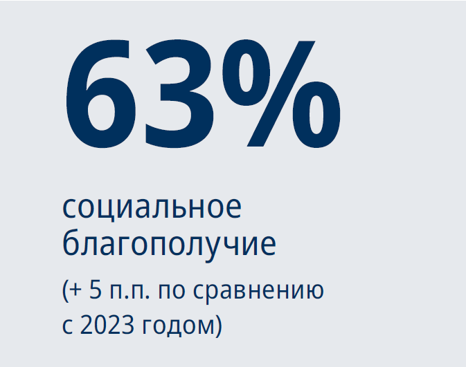 По результатам отчётного периода индекс социальной стабильности (SRS) составляет 72% (+2 п.п. по сравнению с 2023 годом). Данный показатель – это совокупный индекс вовлечённости, благополучия и социального спокойствия.