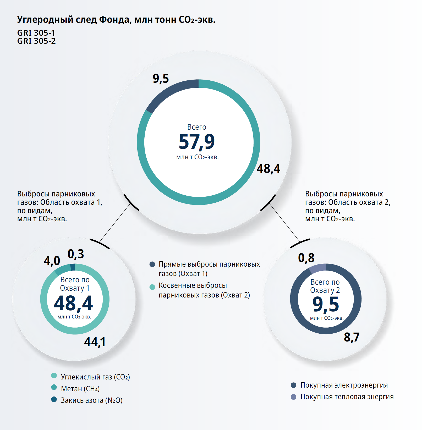 В 2024 году углеродный след Группы Фонда (прямые и косвенные выбросы парниковых газов) составил 57,8 млн т CO2-экв. По сравнению с 2023 годом суммарные выбросы парниковых газов сократились на 3% (в 2023 году – 59,8 млн т CO2-экв.).