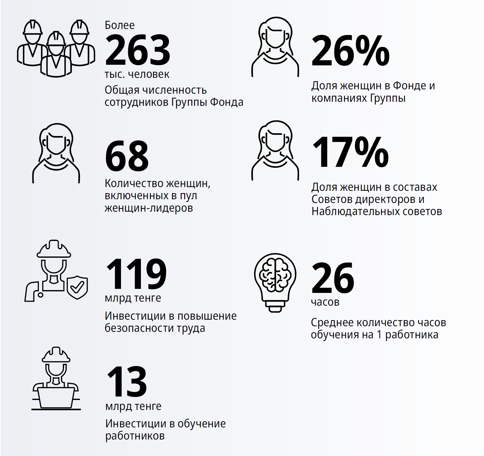 В Фонде внедрён Корпоративный стандарт по управлению человеческими ресурсами, который определяет принципы, подходы и требования к HR-процессам, способствует внедрению лучших HR-практик в Группе АО «Самрук-Қазына» и основан на Кадровой политике АО «Самрук-Қазына». Корпоративный стандарт является основой для разработки внутренних документов, регулирующих HR-процессы административно-управленческого персонала, в Группе Фонда. При этом нормы Корпоративного стандарта применяются портфельными компаниями с учётом специфики деятельности в рамках базовых принципов.