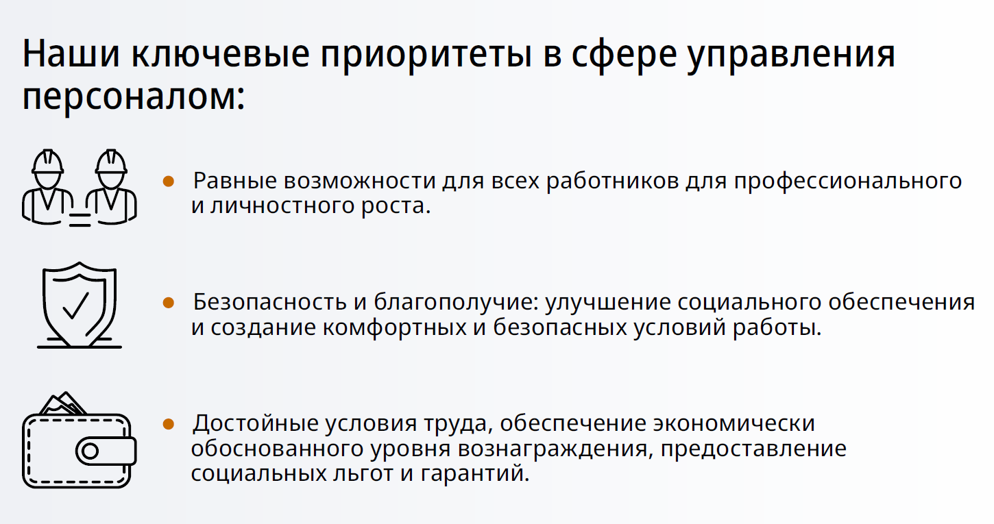 - Фокус на поддержание баланса интересов работников и работодателя за счет внедрения практик IR, HSE, CSR по всей Группе компаний Фонда.