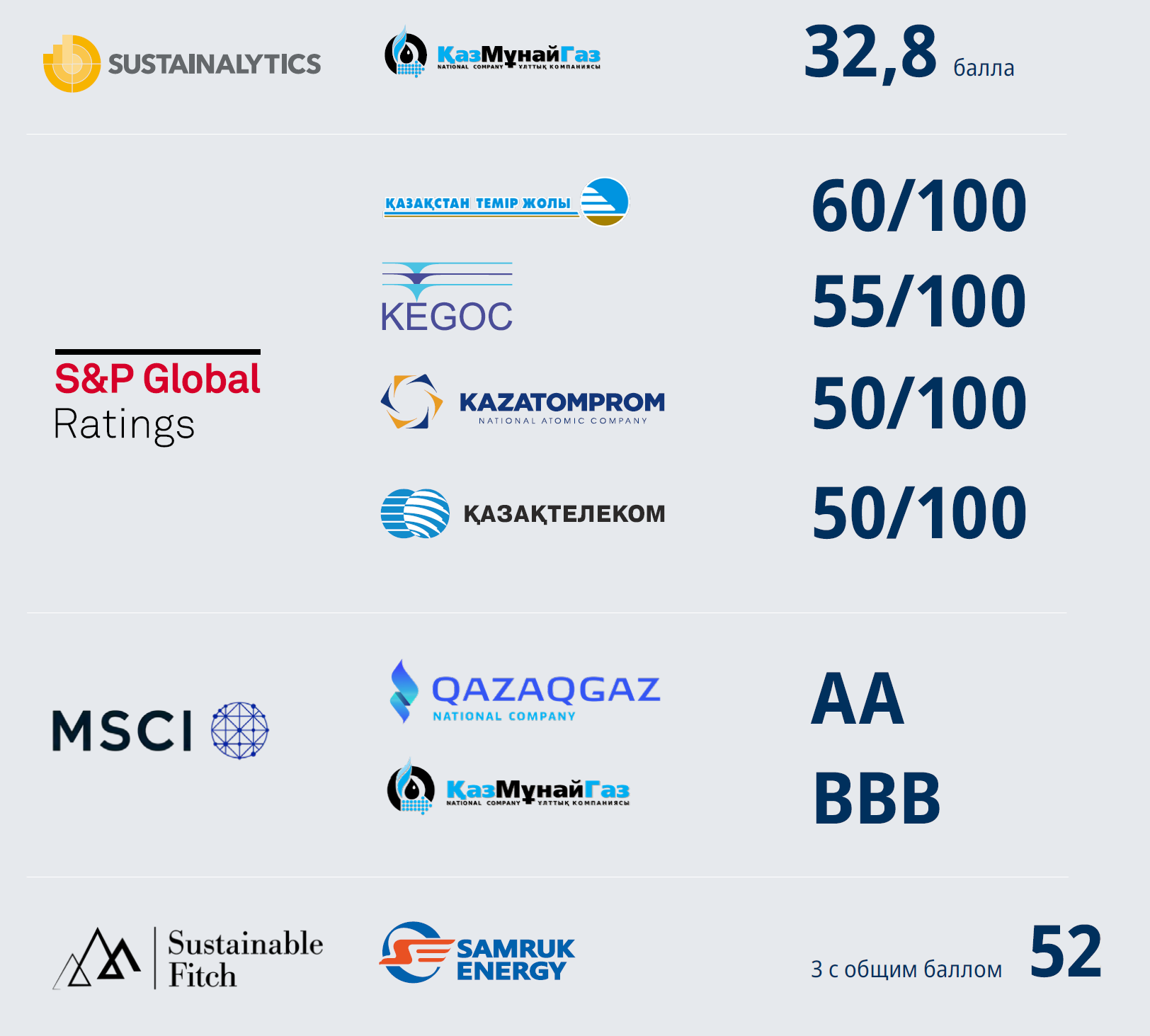 Портфельные компании демонстрируют преимущественно положительные результаты в международных ESG-рейтингах как среди компаний Казахстана, так и на мировой арене в своих отраслях.